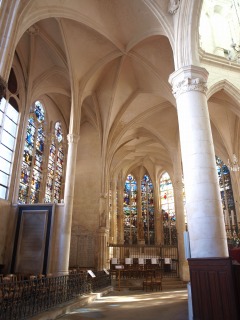 Déamubulatoire et chapelles rayonnantes 周歩廊と放射状祭室も16世紀に遡り、オジーヴ・ヴォールトで覆われています。 10も設けられた開口部で明るい中央祭室は、2ベイで構成され、聖母マリアを祀ります。その他の祭室は、奥行きが浅い造りになっています。 Voûtés d'ogives, le déamubulatoire et des chapelles rayonnantes datent également du 16e siècle. Eclairée par dix fenêtres, la chapelle axiale de deux travées est dédiée à la Vierge. Les chapelles latérales sont peu profondes. |