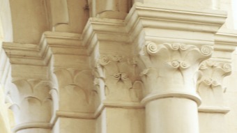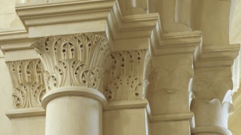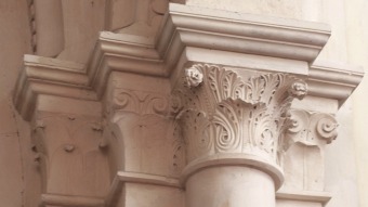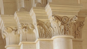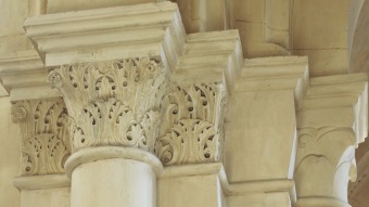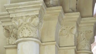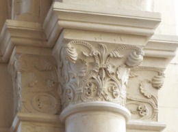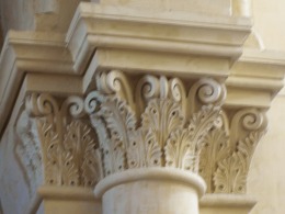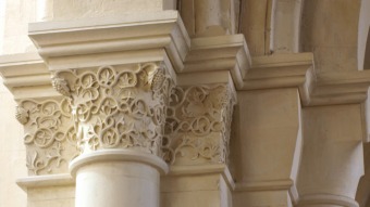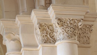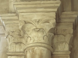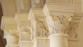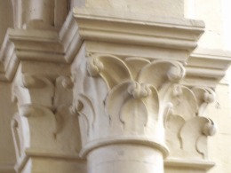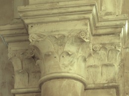 身廊の柱頭はロマネスク期のものですが、修復されています。これら柱頭はアカンサスの葉、ウォーターリーフ、アルムの実等で装飾されています。 |