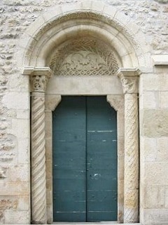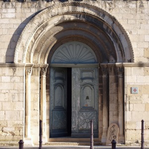 Portail occidental 手前に張り出した構造部分に設けられたロマネスクの西入口は、4層のヴシュールに囲まれ、ヴシュールは彫刻が施された柱頭を戴く円柱へと繋がります。このうち2つの円柱には縦溝彫りの装飾があります。 S'ouvrant dans un avant-corps, le portail occidental roman est encadré de quatre voussures, reposant sur les chapiteaux sculptés des colonnes dont deux fûts sont cannelés. |