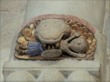 Chapiteauxsculptés ヴシュールを受ける円柱の柱頭には、植物やモンスターの頭が彫刻されています。 Recevant les voussures, les chapiteaux des colonnes sont sculptés de feuillages ou de têtes monstrueuses. |