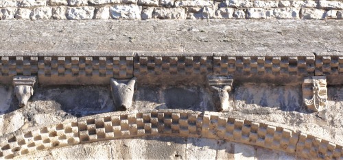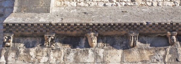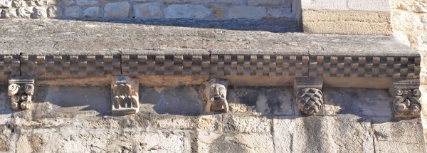 L'avant-corps de la façade occidentale est couronné des corniches ornées de billettes, qui sont soutenues par les modillons sculptés de têtes humaines et animales. |