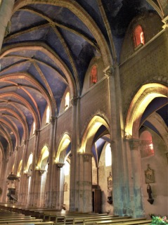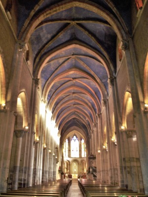 Nef 身廊は9ベイで、オジーヴ・ヴォールトで覆われています。東側の3つのヴォールトの頂石は、ボジュー領主の紋章で装飾されています。 ヴォールトの青色や壁の幾何学モティーフの彩色装飾は、1850‐1870年に施されました。 La grande nef se compose de neuf travées, couvertes de la voûte d'ogives, dont les trois clefs du côté oriental sont décorées d'armes des Sires de Beaujeu. La polychromie en bleu des voûtes et le décor peint à motif géométrique des murs ont été faits de 1850 à 1870. 中央身廊と南北の側廊の間には、十字型のピラーに繋がる尖頭型の大アーケードが並びます。 La nef centrale est séparée des bas-côtés par les grandes arcades brisées, retombant sur les piliers cruciformes. |