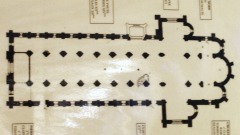 | Plan de l'église ロマネスクからゴシックへの移行期に建てられたベルヴィルの教会堂は、クラシックなベネディクト会のプランを採用しています。教会堂は、9ベイの三身廊、2つの後陣祭室がある張り出したトランセプト、2ベイの内陣、アプスで構成されます。内陣にも側廊があり、その東側にもそれぞれ後陣祭室があります。 Bâtie à l'époque de transition du roman et au gothique, Notre-Dame de Belleville adopte un plan bénédictin traditionnel : elle se constitue de trois nefs de neuf travées, d'un transept saillant avec deux absidioles orientées, et d'un choeur de deux travées se terminant par une abside : celui-ci est flanqué de part et d'autre d'un collatéral, prolongé chacun par une absidiole. |