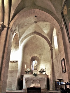 Collatéraux et absidioles 内陣の両脇にも交差ヴォールトで覆われた側廊があり、側廊の東端には、それぞれセミ・ドームで覆われた後陣祭室があります。 Le choeur est flanqué de part et d'autre d'un collatéral voûté d'arêtes, se terminant par une absidiole en cul-de-four. 南後陣祭室は、聖母マリア祭室と呼ばれ、聖母マリアの母子像があります。黒い聖母マリア像のスタイルですが、教会堂建設当時のものではありません。 L'absidiole sud, chapelle de la Vierge Marie, renferme une statue de la Vierge à l'Enfant sous forme de Vierge noire, mais elle n'est pas d'époque. 北側廊の後陣祭室では、マルタ十字のモザイクが床に嵌め込まれています。これは恐らく、かつて教会堂の北東にあったコマンドリーにあったものと考えられますが、このコマンドリーもまた、ウンベルト3世が小修道院設立以前に創建したものです。 L'absidiole nord montre sur le dallage, une mosaïque de la croix de Malte, provenant probablement de la commanderie, autrefois située au nord-est de l'église : celle-ci aussi, était fondée par Humbert III, avant l'établissement du prieuré. |
