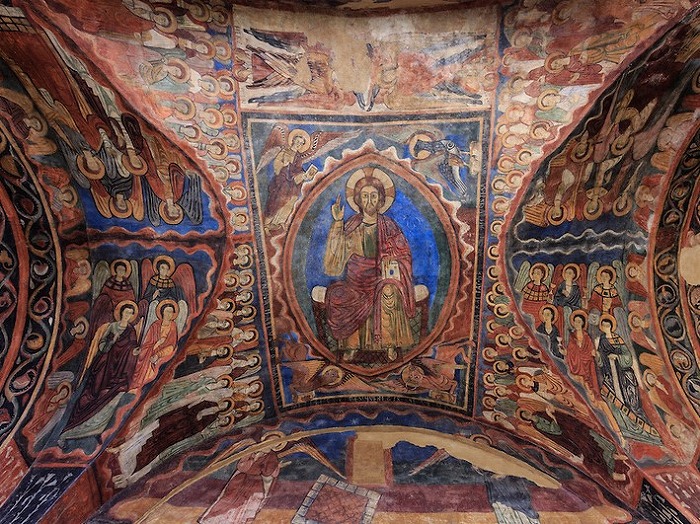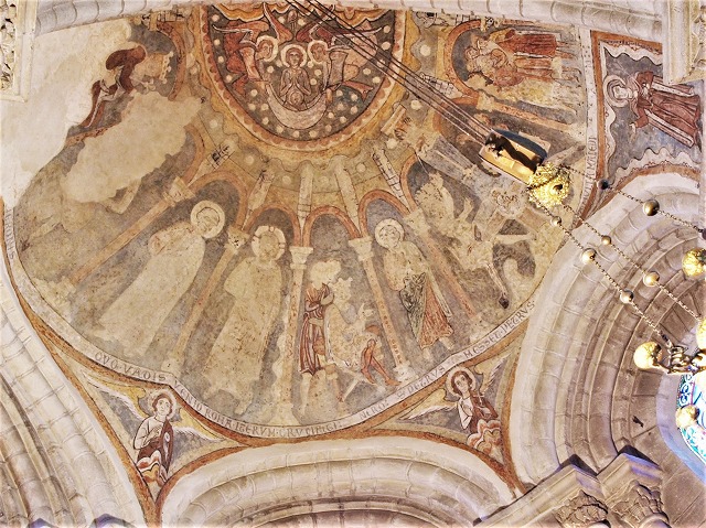 | Sur la voûte, domine le Christ en majesté. Le Christ assis dans une mandorle ondulée, bénit de la main droite et pose l'autre main sur le livre de l'Apocalypse. Il est entouré des symboles de quatre évangélistes. Autour d'eux, une centaine d'anges se déploie sur la voûte : au-dessus du Christ, se trouvent un séraphin et un chérubin. Les peintures occupent tout l'espace. Le mur nord montre, dans la partie basse, l'enfer, et dans la partie haute, la victoire des archanges Michel et Gabriel sur Satan. |