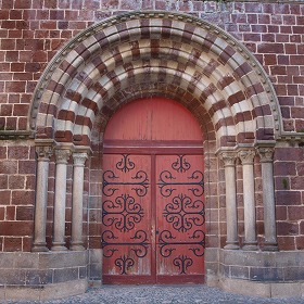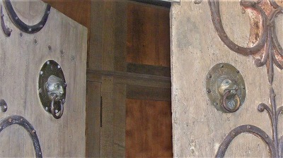 | 南入り口の、かつては動物の皮で覆われていたという扉には、ロマネスク期のPenture(鉄の装飾)が残ります。 | ||