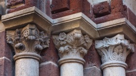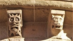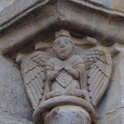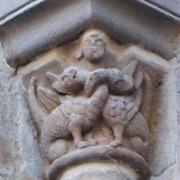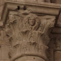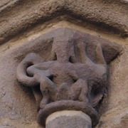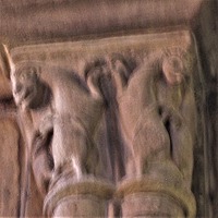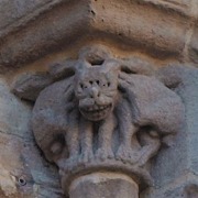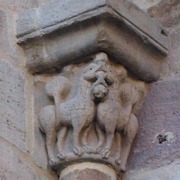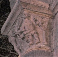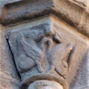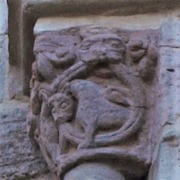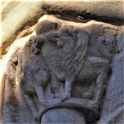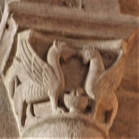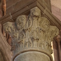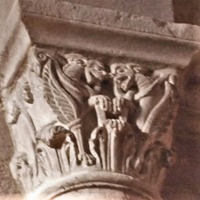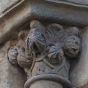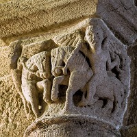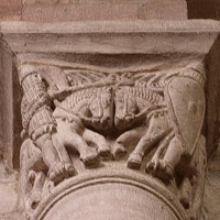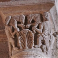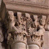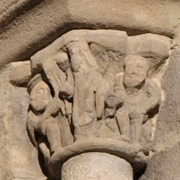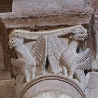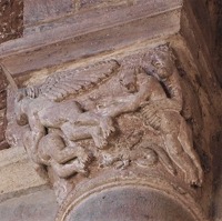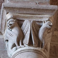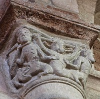 | 柱頭彫刻の制作には、6つのアトリエが携わったとされます。そのうちまず「モザの彫刻師」と呼ばれるアトリエが挙げられ、Tritons、Tritonnes (ou sirènes)、Aigles aux ailes déployées等を表現した柱頭が該当します。そして「ブリウドの彫刻師」とされるアトリエは、Porteurs demoutons、 Le combat de chevaliers、 L'enlèvement d'une âme par les anges、 Cavaliers sur les lions等を手掛けたとされます。 ブリウド/サン・ジュリアンの柱頭では、コリント風の植物モティーフ、空想の動物(グリフォン、人魚、キメラ等)、オーヴェルニュ特有のテーマを表現したもの(Porteurs de moutons、 Montreur de singe等)、悪徳を表現したもの(吝嗇、色欲等)が多く目につきます。聖人伝をあらわらした柱頭彫刻は2つ(Anges évangélistes、Saintes Femmes au tombeau)あります。 |