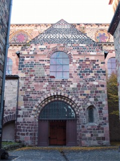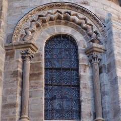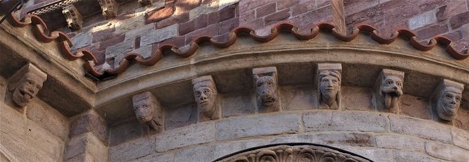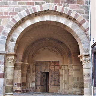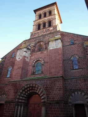 | Façade occidentale et son portail central ロマネスクの教会堂の西ファサードは、1060-1100年の間に建てられ、ここからロマネスク教会堂の建設が始まりました。西ファサードの鐘楼は、1794年革命時に破壊されました。 西ファサードは2層からなる四角の鐘楼も併せて、1862-1863年の間に建築家エイモン・マレにより再建されました。この時ネオ・ロマネスク様式で3つの入り口が造られました。マレは、オリジナルのスタイルからではなく、オーヴェルニュに建つその他のロマネスクの大教会堂からインスピレーションを得て、数々の修復工事を実施しました。 La façade occidentale de l'église romane a été édifiée entre 1060 et 1100. Elle était le point de départ de la construction. Le clocher de la façade occidentale a été abbatu, lors de la Révolutiion. La façade occidentale avec le clocher carré à deux étages, a été reconstruite de 1862 à 1863 par l'architecte Aymon Mallay, créant trois portails néo-romans. Mallay a mené les travaux en s'inspirant des autres grandes églises romanes auvergnates, à part le style originel. |