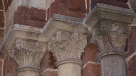 | 北ポーチは、北側廊の2番目のベイに位置します。半円型の入り口には、スタッコのタンパンがありました。 | トランセプトは南北に張り出していません。ここに見える半円型の開口部は、柱頭彫刻がある小円柱で装飾されています。 | |