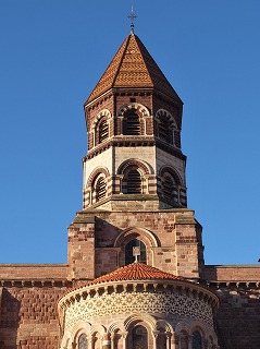 Clocher de la croisée du transept トランセプト交差部に聳える鐘楼には、中世末に尖塔が取り付けられましたが、革命時にその尖塔は落とされました。19世紀、鐘楼は建築家マレにより再建されました。今日の鐘楼の尖塔までの高さは、53メートルに達します。 Couronné d'une flèche depuis la fin du Moyen Age, le cloher de la croisée du transept a été décapité par les révolutionnaires. Il a été reconstruit au 19e siècle par l'architecte Mallay : le clocher actuel culmine à 53 m au sommet. マレは数多くのオーヴェルニュの大教会堂、クレルモン・フェランのノードル・ダム・ド・アソンプション大聖堂、同ノートル・ダム・デュ・ポール大聖堂、ル・ピュイのノートル・ダム大聖堂、リオンのサン・タマブル大聖堂、サン・ネクテールのサン・ネクテール教会、イソワールのサン・トーストルモワヌ教会、オルシヴァルのノートル・ダム大聖堂等の修復工事に携わっています。 Mallay s'est occupé des reconstructions de nombreuses églises auvergnates : la cathéderale Notre-Dame-de-l'Assomption de Clermont, la basilique Notre-Dame-du-Port de Clermont-Ferrand, la cathédrale Notre-Damed-de-l'Annonciation du Puy-en-Velay, la basilique Saint-Amable de Riom, l'église Saint-Nectaire de Saint-Nectaire, l'église Saint-Austremoine d'Issoire, la basilique Notre-Dame d'Orchival, etc.. |