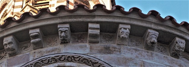 | Les baies du déambulatoire et des chapelles rayonnantes sont surmontées des corniches à modillons. | Les voussures des baies des chapelles rayonnates à deux côtés sont plus sculptés. |