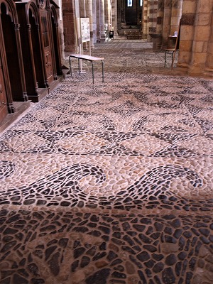 | Le pavé revêt le sols de la nef et les bas-côtés. Realisée au 16e siècle, la mosaïque camaïeu faite de galets de rivière, dessine des rosace, des entrelacs, des volutes, etc.. |