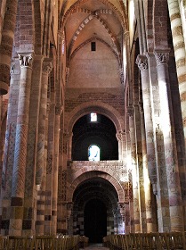 | Précédée d'un narthex, la nef mesure 6,50 m de largeur. Sa construction a débuté à partir de 1060. La nef de cinq travées, a été surhaussée et voûtée d'ogives à la seconde moitié du 13e siècle. | L'élévation de la nef est à deux niveaux. Les grandes arcades à double rouleau, légèrement brisée, reposent sur les piliers en cruciformes, que les demi-colonnes flanquent sur quatre faces. Elles sont surmontées des fenêtres hautes et des rosaces. |