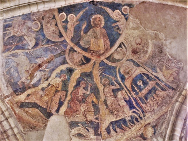 | Le cul-de-four de la chapelle de Sainte-Philomène (sud-est), montre les fresques représentant le chapitre VI de l'Apocalypse. Le Christ dans une mandorle, bénisant de la main droite, tenant dans la gauche le livre, est entouré des anges et des symboles de quatre évangélistes. Au-dessous du Christ, quatre cavaliers se dirigent vers le ciborium, et à gauche, l'apôtre Jean écrit la vision prophérique. |