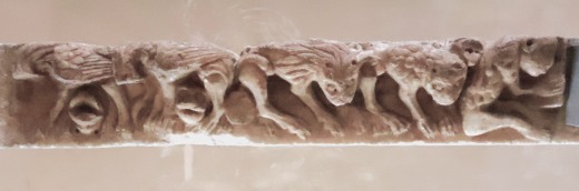 | Frise du bestiaire タンパン下にあるフリーズには、ライオンとサルが彫刻されています。 Sous le tympan, une frise présente une série de lions et de singes. |