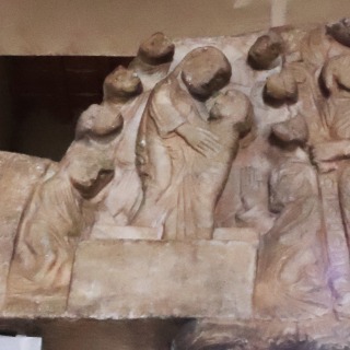 Partie gauche : la résurrection de la Vierge タンパン左部分は、聖母マリアの復活を表現しています。 マリアがイエスによって墓から引き上げられています。2人の両脇で、2人の使徒が跪いています。左がヨハネ、右がペテロです。この場面の周りには複数の天使の姿があります。 La partie gauche du tympan illustre la résurrection de la Vierge Marie est soulevée du tombeau par son fils. A leurs côtés, deux apôtres sont agenouillés : saint Jean à gauche, saint Pierre à droite. Plusieurs anges entourent la scène. |