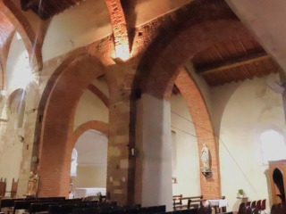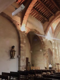 身廊には南側に、半円型の大アーケードで隔たれた側廊があります。この南側廊も木造天井で覆われ、各ベイに装飾がない半円型の開口部が3つ設けられています。側廊の東端には、小さな半円型の開口部から採光する後陣祭室があります。 La nef est flanquée au sud, d'un bas-côté, séparé par de grandes arcades en plein cintre. Ce bas-côté méridional, couvert lui aussi de la charpente, est percé de trois baies en plein cintre sans décor. Il s'achève par une absidiole éclairée par une petite baie en plein cintre. |