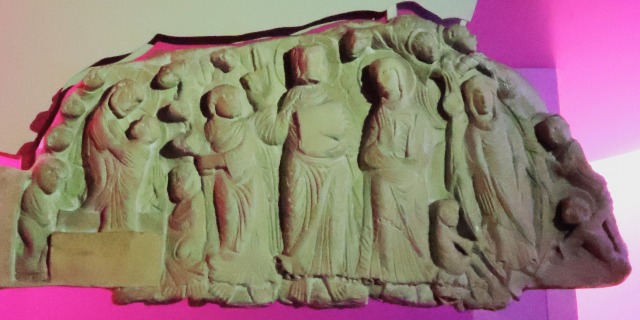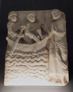 Bas-relief : l'Apparition du Christ ressuscité aux disciples この白大理石製のレリーフは、サン・ペラ・ダ・ローダス修道院の教会堂入り口を飾っていたものです。オリジナルは今日、バルセロナのフレデリック マレス・ミュージアムに収蔵されています。 Ce bas-relief en marbre blanc provient du portail de l'église de Sant Pere de Rodes. L'original est aujourd'hui conservé au musée Frédéric Marés de Barcelone. このレリーフは、ヨハネによる福音書に基づきある、復活したキリストがティベリアス湖(ガリラヤ湖)で使徒達の前に現れる場面を描きます。実際、場面の上方に、「UBI DOMINUS APARUIT DISCIPULIS IN MARI(そこで主は海上で弟子達の前に現れた)」というラテン語の銘が刻まれています。 キリストはチュニカを着て、波打つ湖面に立っています。湖には2匹の魚の姿があります。キリストは「PAX VOBIS(あなた達に平和を)」という銘が刻まれた本を左手に持ち、もう一方の手を挙げて、キリストの右側に描かれている使徒、小舟に乗った髭を生やしたペトロ(右)とヨハネ(左)に向かって祝福のポーズをとっています。 Cet oeuvre représente selon l'Evangile de Jean, l'Apparition du Christ ressuscité aux apôtres sur le lac de Tibériade (mer de Galilée). Une inscription latine est gravée dans la partie supérieure de la scène : UBI DOMINUS APARUIT DISCIPULIS IN MARI ("Là, le Seigneur apparut à ses disciples sur la mer"). Vêtu d'une tunique, le Christ se tient debout sur les eaux ondulées, où se trouvent deux poissons. De la main gauche, il tient un livre portant l'inscription PAX VOBIS ("Que la paix soit avec vous"), tandis que de l'autre main levée, il adresse un geste de bénédiction aux apôtres représentés à sa droite : saint Pierre, barbu et saint Jean, tous deux dans une barque, tenant des rames. |