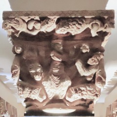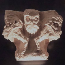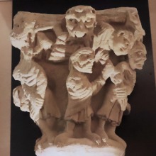 この柱頭は、預言者ダニエルの生涯における一エピソードである、バビロニア人への処罰を描いていて、5人の人物がライオンに喰われています。アケメネス朝ペルシア帝国初代国王キュロス2世王は、ダニエルを穴から救い出させ、今度はダニエルのことを中傷したバビロニア人達をライオンの穴に投げ入れました。 | |||