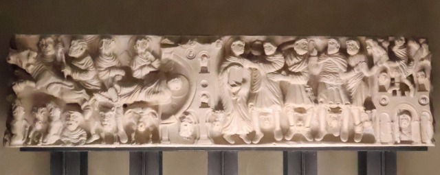 | 石棺の右面には、中央に典礼服を着て、杖と福音書を持ったサトゥルニヌスの姿があり、その脇にやはり殉教する聖人の2人の弟子、ロラゲ(カステルノーダリ)の福音伝道者聖パプルスと、パンプローナ(スペイン)司教聖ホネストゥスの姿があります。 メインの面には左右に2つの場面が描かれます。右側は、サトゥルニヌスの捕縛を表現しています。福音書を広げて持つ聖人は4人のローマ兵にトゥールーズのカピトルというローマの神殿の前で捕まえられます。その光景を女性達が建物の窓から眺めています。 左側には、聖人の殉教が描かれます。聖人は刑吏に鞭打たれて怒り狂う雄牛に引き摺られていますが、同時にその上に描かれている2人の聖女プエラを右手で祝福しています。 左側の面は、サトゥルニヌスの埋葬の場面に捧げられています。中央で2人の聖女プエラがサトゥルニヌスの遺体を墓に埋葬しています。墓の周りには天使や女性達の姿があります。裸の小さな人物として描かれる聖人の魂は肉体を離れ、天に昇っていきます。天からは神の手が現れています。 |