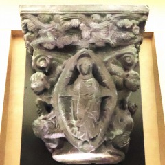 Chapiteau de l'Assomption この砂岩の柱頭は、リュー・ミネルヴォワのサント・マリー教会の周歩廊にあるもので、聖母マリアの被昇天を表現しています。 アーモンド型のマンドルラの中にいる聖母マリアは目を閉じ、柱頭の側面に描かれる翼を広げた天使達によって天国に引き上げられています。 アバクスは植物モティーフ(パルメットと唐草モティーフ)で装飾されています。 Ce grand chapiteau en grès provient du déambulatoire de l'église Sainte-Marie de Rieux-Minervois. La Vierge, les yeux clos, est inscrite dans une mandorle en forme d'amande et élevée vers le Ciel par des anges aux ailes déployées, figurés sur les faces latérales du chapiteau. Le tailloir est orné de motifs végétaux : palmettes et rinceaux. |