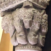 Chapiteau aux lions この砂岩の柱頭も、リュー・ミネルヴォワの教会堂の周歩廊にあるもので、豊かな鬣を持つ4頭のライオンの姿が見えます。ライオンは2頭ずつひとつの頭の下で胴体が繋がっています。ライオンの目は斜めに細長く、トレパンの穴で強調されています。 アバクスは星形の花で装飾されています。 Ce chapiteau en grès, également issu du déambulatoire de l'église de Rieux-Minervois, présente quatre lions à la crinière abondante. Leurs corps se rejoignent deux à deux sous une même tête. Leurs yeux, obliques et allongés, sont accentués par des trous de trépan. Le tailloir est décoré d'une série de fleurs étoilées. |