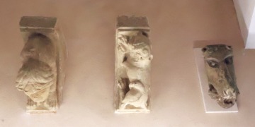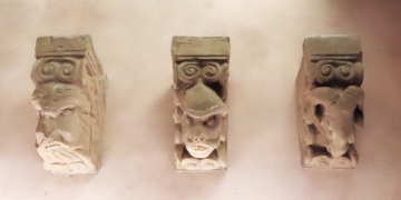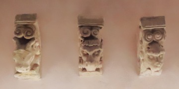 Modillons これらのモディヨンは、サン・パプル修道院教会のアプスを飾っているもので、モンスターや動物、人間の頭が彫刻されています。 大半のモディヨンは渦巻きモティーフのフリーズで縁取られています。 Ces modillons provenant de l'abside de l'église abbatiale de Saint-Papoul, sont sculptés de têtes de monstres, d'animaux ou d'hommes. La plupart sont bordés d'une frise de volutes. |