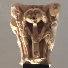 サン・パプルのベネディクト会修道院は、9世紀に創設され、1317年にカテドラルとなりました。カブスタニーの匠は、修道院教会の後陣の柱頭とモディヨンの彫刻を手掛けました。素材は石灰岩です。 Fondée au 9e siècle, l'abbaye bénédictine de Saint-Papoul a été élevée au rang de cathédrale en 1317. Le Maître y a réalisé des chapiteaux et des modillons en calcaire ornant le chevet de l'abbatiale. Chapiteau aux lions engoulant des pattes 柱頭の中央に、髭を生やした男の頭があります。そして柱頭の角には、ライオンが動物を貪り食っていて、ライオンの口から動物の脚が出ているのが見えます。 Au centre de la corbeille, est figurée une tête d'homme barbu. Sur chacun des angles, un lion dévore un animal dont seules les pattes sortent de sa gueule. |