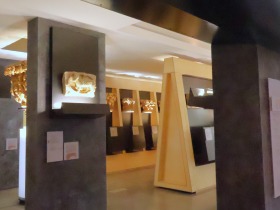| Bas-relief : Agnus Dei この白大理石製のレリーフは、サン・ペラ・ダ・ローダス修道院教会入り口のメインのアーキヴォールトのキーストーンだったと考えられています。このレリーフのオリジナルも、バルセロナのフレデリック・マレス・ミュージアムに所蔵されています。 キリストのシンボルである子羊は十字架を携えていて、目にはトレパンの穴が穿たれています。 Ce bas-relief en marbre blanc proviendrait de la clé de l'archivolte principale du portail de l'église de Sant Pere de Rodes. L'original est également conservé au musée Frédéric Marés de Barcelone. L'Agneau, symbole du Christ, tient une croix et présente des yeux percés de trous de trépan. |