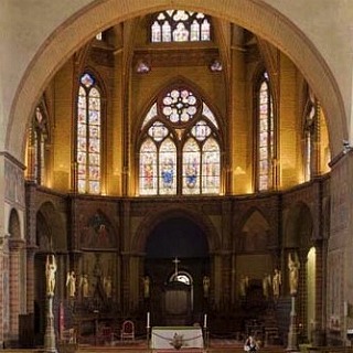 | Abside 12世紀に遡るロマネスク期の土台の上に、後陣はゴシックのスタイルで14世紀初めに再建されました。 身廊に直接面したアプスは、天井はオジーヴ・ヴォールトで覆われ、柱頭彫刻がついた8つの円柱で7面が形成されています。北側にある2つの柱頭彫刻はロマネスク期のものです。 アプスは3層に分かれ、地上層では7つの連続アーチが並び、上の2層ではランセットの開口部が見えます。 1870-1875年の間にアプスはネオ・ゴシック・スタイルで修復されました。 Sur le soubassement roman du 12e siècle, l'abside gothique a été reconstruite au début du 14e siècle. S'ouvrant directement sur la nef, l'abside à sept pans, qui est formée de huit colonnes à chapiteaux sculptés, dans lesquels deux au côté nord sont romans, est voûtée d'ogives. Elle est surélevée de trois niveaux. On trouve sept arcatures au rez-de-chaussée, et des baies à lancettes aux niveaux supérieurs. Entre 1870-1875, l'abside a été restaurée en style néo-gothique. |