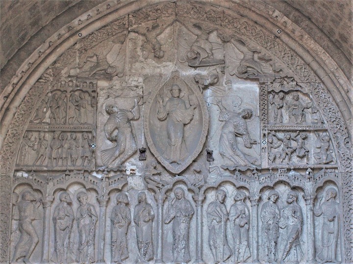 | 下の層には、三葉のアーケードの下に、聖母マリア(中央)と11人の使徒の姿があります。ユダが欠けているようです。 右から2番目の人物は、モワサックのサン・ピエール修道院教会のエレミヤ像のように、脚をクロスさせて表現されています。このことから、カオールの彫刻士はモワサックの彫刻士と同一と考えられます。スイヤックのサント・マリー修道院教会のイザヤ像も、同様に表現されています。 ちなみに専門家によっては、左端にいる他の使徒らとは異なるポーズをとっている人物は、己の作品にサインをしている彫刻士を表現しているとされます。 |
