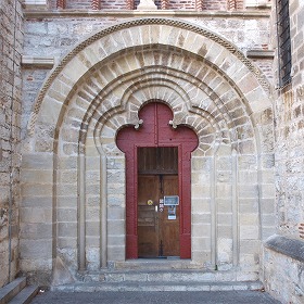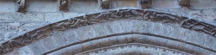 | Portail sud roman 1130年頃造られた教会堂南側の入り口では、馬蹄型の三葉のアーチが見られます。この装飾はモザラベ美術の影響で特にフランス南西部で広がりました。 Construit vers 1130, le portail sud est décoré de l'arc trilobé avec des arcs outrepassés, qui s'est développé notamment dans le Sud-Ouest de la France sous l'influence de l'art mozarabe. |