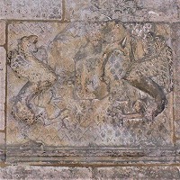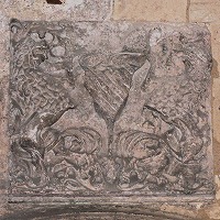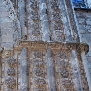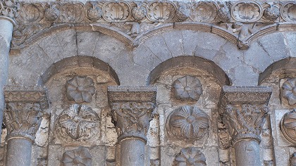 | 入り口は花モティーフで装飾されています。入り口の脇には、柱頭彫刻がある小円柱と繋がる連続アーチが見られます。 | ||