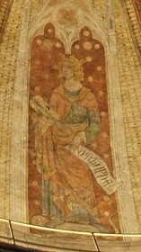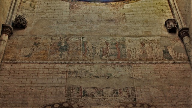 | 身廊の手前に数段高くなっているナルテックスがあり、その両脇に祭室があります。 ナルテックスには1316-1324年の間に制作されたフレスコ画があり、創世記と原罪の一連のシーンが展開されます。これらは1988年、パイプオルガンの修復工事の際に発見されました。 |