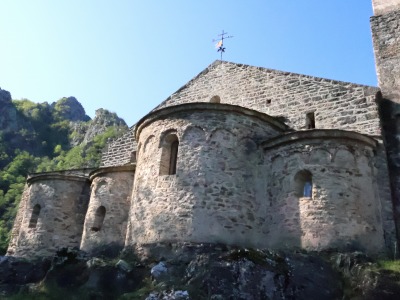 | Chevet de l'église supérieure 上教会堂は下教会堂より東側に少し飛び出していて、上教会堂の3つの半円プランのアプスは岩に支えられています。 上教会堂の3つのアプスのうち、中央のアプスが最も大きくなっています。3つのアプスはロンバルディア帯で装飾され、それぞれ小さな隅切りされた半円型の開口部がひとつ設けられています。 L'église supérieure dépasse légèrement du côté est par rapport à celle inférieure : ses trois absides hémicirculaires reposent sur le rocher. Celles-ci, dont la centrale est la plus grande, sont ornées de bandes lombardes et percées chacune d'une petite baie ébrasée en plein cintre. 南アプスに隣接しているのは、サン・ゴデリック祭室のアプスです。祭室のアプスにはロンバルディア帯の装飾は見られません。 Du côté sud de l'abside sud, jouxte l'abside de la chapelle Saint-Gaudérique, dépourvue de décor de bandes lombardes. |