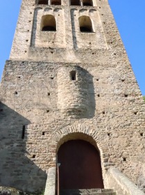 | 右は鐘楼の西ファサードです。 最下層には、2つの半円型の入り口が東と西にあります。更に鐘楼へは、上教会堂の北側廊の最後のベイにある入り口からもアクセスできます。 またこの層には、1026年に奉献された、大天使ミカエルを祀る祭室が設けられています。 Au rez-de-chaussée, le clocher s'ouvre par deux portes en plein cintre à l'est et l'ouest. Par ailleurs, il est également accessible depuis l'intérieur de l'église supérieure, par une porte ouverte à la dernière travée du bas-côté nord. Cet étage abrite la chapelle dédiée à l'archange Michel, consacrée en 1026. 2層目には各面に半円型の開口部が2つずつ設けられていて、上教会堂の3つのアプスのように、ロンバルディア帯で装飾されています。 3層目には元来各面に2つ一組の開口部がありました。その様は東ファサードで今日も観察できます。しかしその他の三面については、建物を強化するため、塞がれ、或いは単一の開口部に造り替えられています。 Le premier étage est orné de bandes lombardes, comme les trois absides de l'église supérieure. Il est percé sur chaque face, de deux baies en plein cintre. Le deuxième étage était à l'origine, percé sur chaque face, de deux baies géminées avec colonnettes, encore visibles sur la face est. Mais sur les trois autres faces, elles ont été murées ou remplacées par des baies simples pour consolider l'édifice. 鐘楼は元来ピラミッド型の屋根で覆われていました。しかし1428年の地震で鐘楼上部が崩壊し、その後1433年に実施された修復工事で現在の三角形の胸壁が新たに造られました。 Le clocher est aujourd'hui couronné de créneaux triangulaires au lieu de la toiture pyramidale d'origine. Cette modification a été réalisée lors des travaux de restauration effectués en 1433 à la suite du tremblement de terre de 1428 qui avait détruit la partie supérieure du clocher. |