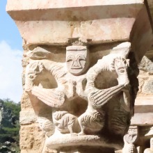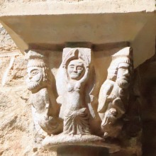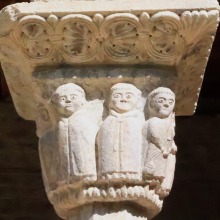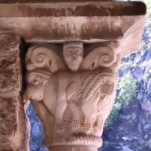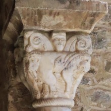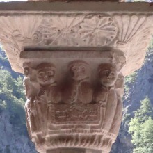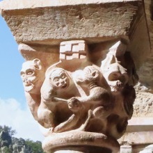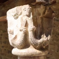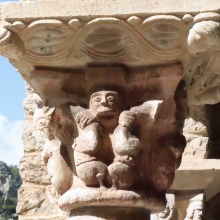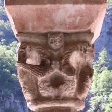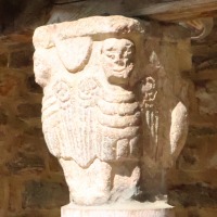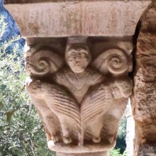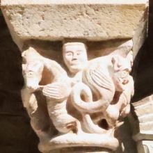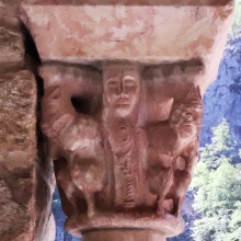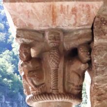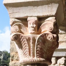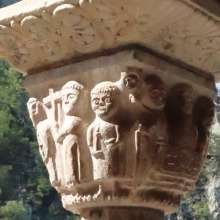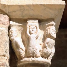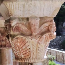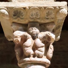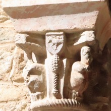 Chapiteaux sculptés 南ギャラリーの南側のアーケードを支える柱頭は、2つのグループに分けられます。 ひとつは白大理石で造られた柱頭群で、1170年頃に遡ります。 一部の専門家らは、これら柱頭のイコノグラフィーはセラボンヌのサント・マリー・小修道院やサン・ミシェル・ド・クシャ修道院のそれに、またスタイルはサン・タンドレ・ド・ソレード教会の回廊を彩る12世紀末に制作された柱頭のそれに似ていると指摘しています。 もう一方の柱頭群については、ヴィルフランシュ・ド・コンフラン産のグリオッテ(赤系統色の大理石)が用いられており、13世紀に制作されました。 Recevant des arcades du côté méridionale de la galerie sud, les chapiteaux se divisent en deux groupes. Un ensemble, en marbre blanc, date d'environ 1170. Certains spécialistes soulignent que leur iconographie est similaire à celle des chapiteaux du prieuré Sainte-Marie de Serrabonne et de l'abbaye de Saint-Michel-de-Cuxa, et leur style est semblable à celui des chapiteaux datant de la fin du 12e siècle au cloître de l'église Saint-André-de-Sorède. Un autre ensemble, en marbre griotte provenant de Villefranche-de-Conflent, a été réalisé au 13e siècle. |