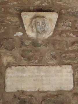 | Tête sculptée de Guifred II et plaque gravée ギフレ伯と第2の妻エリザベスの彫刻された頭も、南ギャラリーの北側のピラーに埋め込まれています。 Les têtes sculptées du comte Guifred II et de sa deuxième épouse, Elisabeth, sont également insérées dans les piliers du côté nord de la galerie sud. ギフレ伯の顔の彫刻の下には、ラテン語で伯とその妻エリザベスの遺骨が1332年に当時の修道院長によって教会堂内部に移されたことを記す石碑が壁に埋め込まれています。 Au-dessous de la tête sculptée de Guifred II, on découvre une dalle gravée en latin relatent la translation des restes du comte et de sa comtesse Elisabeth en 1332 par l'abbé Bérenger de Colomer. |