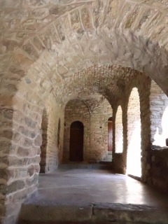 | 1902年より、ペルピニャン・エルヌ司教で、カタルーニャ司教という異名を持つカルサラード・デュ・ポンの提唱により実施された第1期目の大修復工事の際、下層の残っていた3ギャラリーには大幅に修復が施されました。失われた南ギャラリーは、本来の姿とは異なる姿で再建されました。 他方で上層は再建されませんでした。現在、屋根で覆われた南ギャラリーを除くかつての上層ギャラリー部分はテラスになっています。 ちなみに1952年以降に実施された第2期目の修復工事は、アン・カルカのサン・ブノワ修道院の修道士ベルナール・ド・シャバンヌ主導で行われました。 |