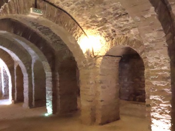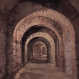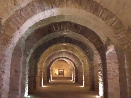 身廊の東側の3ベイは交差ヴォールトに覆われ、二重の横断アーチは柱頭を戴く中央部分が膨らんだ6つの円柱に支えられます。このうち4つの円柱は、上教会堂を支えるため、石積みされたピラーの中に組み込まれています。この円柱の補強は、上教会堂が建設された際に施されました。 Les trois travées orientales de la nef sont couvertes de la voûte d'arêtes sur arcs doubleaux reposant sur six colonnes galbées à chapiteaux. Quatre de ces colonnes sont enrobées dans des piliers de maçonnerie pour mieux soutenir l'église supérieure. Cette consolidation des colonnes a été réalisée lors de la construction de l'église supérieure. 下教会堂は西に向かって拡張されました。 西側の7ベイは円筒型ヴォールトで、ヴォールトを支える横断アーチは十字型のピラーに繋がります。 L'église inférieure s'est élargie vers l'ouest par étapes. Les sept travées occidentales sont voûtées en berceau en plein cintre avec arcs doubleaux, reposant sur les piliers cruciformes. |