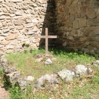 Flanc sud 教会堂内部へは、1980年に設置された木製の南入り口からアクセスします。 身廊の東側に隣接する南北の小さな建物には、半円型の開口部が見えます。 L'accès à l'intérieur se fait par la porte en bois située au sud, installée en 1980. L'annexe sud, accolée à l'est de la nef, est éclairée par une baie en plein cintre, tout comme l'annexe nord. 教会堂への入り口の近くに、「納骨所」と記された木製の十字架が据えられている小さなスペースがあります。ここには1977年に始まった考古学調査の際に発見された遺骨が埋められています。実際のところこの旧教区教会は、サン・マルタン・デュ・カニグーの修道士達の葬儀用の礼拝堂としても利用されていたと考えられています。 Près de la porte d'entrée, se trouve un petit espace marqué par une croix en bois avec une inscription "Ossuaire". Ici, sont enterrés des ossements retrouvés lors des fouilles archéologiques entreprises en 1977. En fait, l'ancienne paroissiale servait vraisemblablement de chapelle funéraire pour les moines de Saint-Martin du Canigou. |
