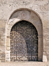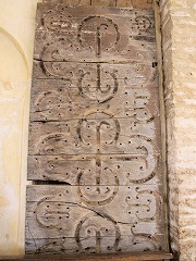Façade occidentale 装飾の少ない西ファサードには、中央身廊と北側廊に繋がる2つの入り口があります。 古い蝶番の装飾が残る中央入り口の上に、葉が彫刻された柱頭がある2つの小円柱を伴った半円型の開口部が見えます。この開口部の周りに、ロンバルディア帯の装飾が見られます。 La façade occidentale, austère, comprend deux portes s'ouvrant sur la nef et le bas-côté nord. Le portail central avec des pentures anciennes est surmonté d'une baie en plein cintre à deux colonnettes avec petits chapiteaux sculptés de feuilles, autour de laquelle, se trouve le décor de bandes lombardes. 西ファサードの手前には、かつてポーチがありました。 La façade précédait autrefois un porche. |