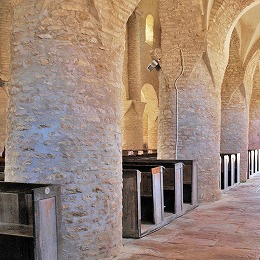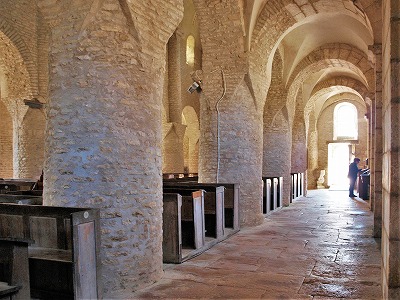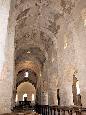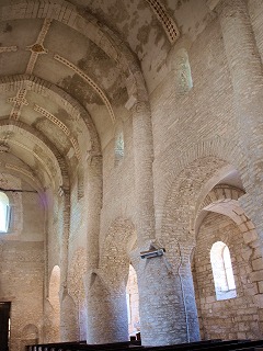| Bas-côté 側廊は交差ヴォールトで覆われ、各ベイの間に横断アーチがわたされています。側廊は一部、12・14世紀に再建されています。 側廊の開口部はロマネスク期では銃眼のような小さなものでしたが、16世紀に現在のより大きなものに造りかえられました。 Couverts de la voûte d'arêtes à doubleaux, les bas-côtés sont partiellement refaits en moyen appareil aux 12e et 14e siècles. Leurs baies ont remplacé au 16e siècle les petites baies-meurtrières romanes. |