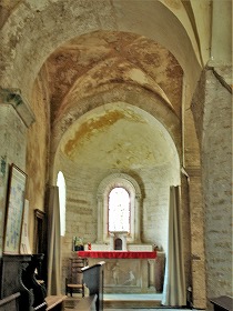 | Nef 身廊は1030年頃に小さなパーツで造られました。トゥルニュのサン・フィリベール修道院教会のナルテックスと同時期です。身廊は5ベイで構成され、その壁の厚みは約1メートルもあります。 元来身廊は半円型のヴォールトで覆われていましたが、崩落の恐れがあったため、1150年頃に尖頭型のヴォールトに造りかえられました。整った切り石で形成される横断アーチは、半円柱へと繋がります。. La nef a été construite en petit appareil autour de 1030, contemporaine du narthex de l'abbatiale Saint-Philibert deTournus. Elle est de cinq travées, dont les murs ont une épaisseur de 1 m environ. Sa voûte en berceau légèrement brisé a remplacé vers 1150, une voûte primitive en plein cintre, menaçant de s'effondrer. Ses arcs-doubleaux en pierre de taille retombent sur les demi piliers cylindriques engagés. 中央入り口の上にある、小円柱を伴った開口部の周りに描かれた壁画には、1343という銘が見えます。ヴォールトの彩色装飾は1543年に施されました。 Les fresques autour de la baie à colonnettes au-dessus du portail principal, portent l'inscription 1343, tandis que le décor peint de la voûte a été réalisé en 1543. |