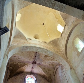 Transept トランセプトは建物の外側に張り出しておらず、両翼廊は1ベイのみで、交差ヴォールトで覆われています。 交差部を囲む4つの円形の柱は崩落の恐れがあったため、1954年に再建されています。 Le transept n'est pas saillant, dont les bras ont une seule travée voûtée d'arêtes. Menaçant de s'effondrer, quatre piliers ronds encadrant la croisée du transept ont été repris en 1954. トランセプト交差部は、トロンプ技法による卵型のクーポルに覆われています。クーポルには連続アーチの装飾があり、開口部が設けられています。このクーポルの上に鐘楼が聳えます。 La croisée du transept est couverte d'une coupole ovoïde sur trompes avec arcatures aveugles et baies en plein cintre. Au-dessus, s'élève l'imposant clocher. |