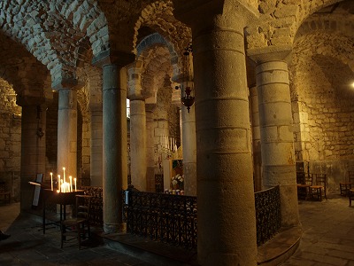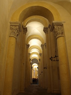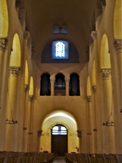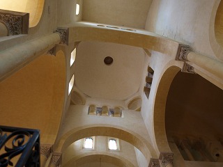 | Croisée / coupole sur trompes トランセプト交差部は、トロンプ技法のクーポルで覆われています。この上に、マシフ・バーロン、次に八角形の鐘楼と続きます。 交差部はダイアフラム・アーチに囲まれ、各壁面に半円型の開口部があります。交差部と両翼廊の間のより高くなっているスペースは、半円筒型ヴォールトで覆われ、やはり半円型の開口部が見えます。 La croisée du transept est couverte d'une coupole sur trompes. Au-dessus, le massif barlong et puis le clocher octogonal s'élèvent à l'extérieur. La croisée est entourée des arcs diaphragmes, percés des baies en plein cintre à chaque face. Les espaces surélevés entre les croisillons, et également percés des baies en plein cintre, sont voûtés en demi-berceau. |