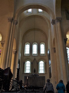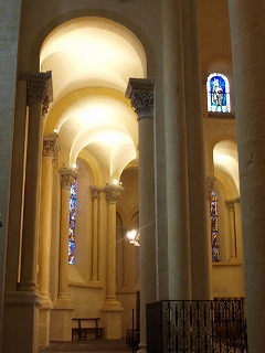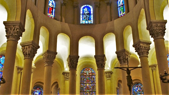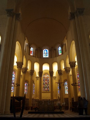 Choeur トランセプトより数段高くなっている1ベイの内陣は円筒型ヴォールトで、8本の円柱で形成される半円形のRond-pointはセミ・ドームで覆われています。 内陣は4つの放射状祭室に面している周歩廊に囲まれています。 Le choeur surélevé d'une travée est voûtée en berceau, dont le rond-point hémicirculaire constitué de huit colonnes est couvert en cul-de-four. Il est enserré du déambulatoire donnant sur quatre chapelles rayonnantes. |