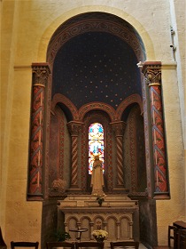 | 後陣は1100−1130年頃に建てられ、オーヴェルニュ・ロマネスク建築の最も美しい典型的一例です。ただ残念なことに、近隣の家々が迫っているため、全体を観察することはできません。 後陣は非常に装飾に富んでいます。黄金色のアルコーズと黒い溶岩で形作られた、精緻な多色使いの格子縞や花モティーフのモザイク、モディヨンがあるコルニッシュ、聖人伝の柱頭彫刻、開口部の上の紐状の飾り等が見られます。後陣のモザイクは、ラヴェンナにあるガッラ・プラキディア霊廟のビザンティン風のヴォールトからインスパイアされているとされます。 1999-2008年の間に後陣は修復されています。 |