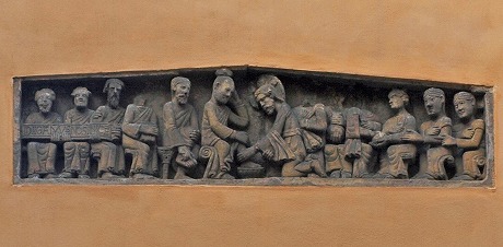 | Linteau : le lavement des pieds このリンテルは、カテドラル・ノートル・ダム近くのプラス・デ・グラにある建物の壁に埋め込まれています。 12世紀に制作された山型のこのリンテルは、フランス革命時に破壊されたサン・ピエール教会を飾っていたものです。聖木曜日(復活祭直前の木曜日)に、キリストが使徒達の足を洗う姿が表現されています。 On retrouve le linteau incorporé dans le mur d'un immeuble dans la place des Gras, tout près de la cathédrale Notre-Dame de l'Assomption. Datant du 12e siècle, ce linteau en batière est provient de l'église Saint-Pierre détruite par les révolutionnaires. Il présente le lavement des pieds des apôtres par le Christ, le jeudi saint (le juedi précédant Pâques). |