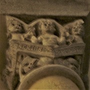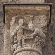 | この柱頭のうち3つの面は、悪徳と美徳を喚起させます。これはオーヴェルニュ・ロマネスクではあまり見かけないテーマです。武装した貪欲と慈悲が、盾を突き合わせて向かい合っています。女性で描かれた憤怒は自分の胸に剣を突きつけ、今にも自殺しそうな様子です。そして慈悲と寛容は悪徳に勝利します。美徳らが貪欲を足下で打ち砕いています。 4番目の面に見られる柱頭を差し出している人物は、内陣の柱頭彫刻の制作を可能とさせた寄進者と考えられており、この人物の隣にいる天使が抱える本に、「IN (H)ONORE(M) S(ANC)T(AE) MARIA(E) STEFANUS ME FIERI JUSSIT」と刻まれています。 |